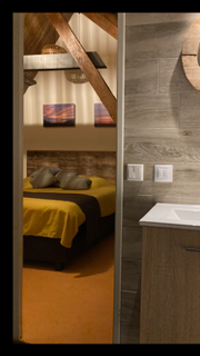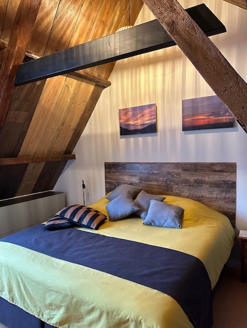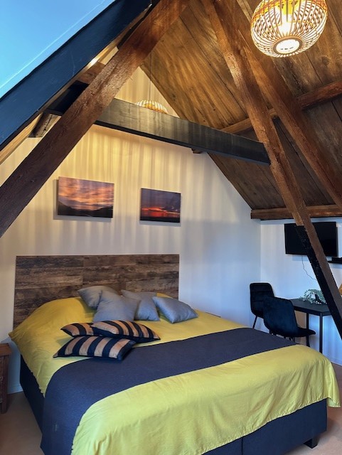 Kamer West heet ook wel strange, oftewel strand. Vanaf de straat gezien gelegen achter de linker dakkapel. Het is de kleinste van de twee kamers, maar niet minder in comfort. Een heerlijk kingsize bed, boxspring van 1.80 x 2.00, zorgt voor een prima nachtrust. De badkamer met douche en toilet ligt aan de achterzijde en bereik je direct vanuit je kamer. Er is een tafeltje met twee stoelen, een klein zitje en een kast om je kleding op te ruimen. Uiteraard is er een televisie en wifi.