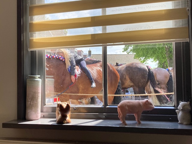 Zo vindt het ringrijden plaats direct voor de deur, je kan de paarden door het raam zien